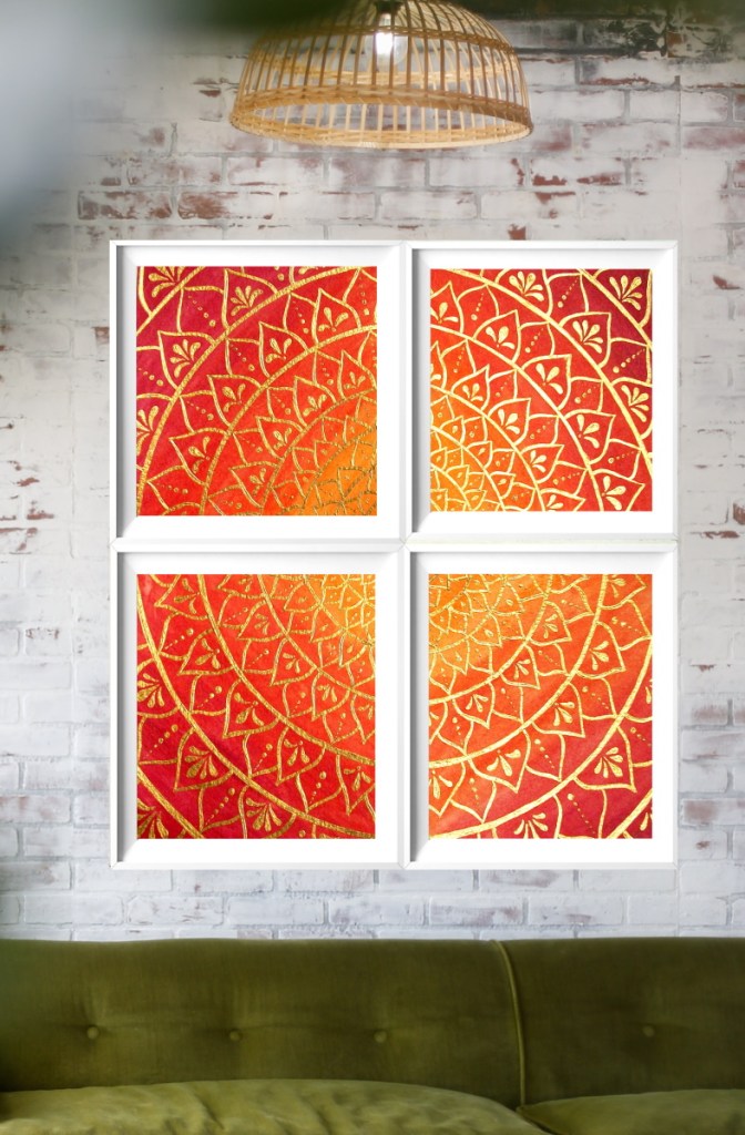 “The sky takes on shades of orange during sunrise and sunset, the colour that gives you hope that the sun will set only to rise again.”Ram Charan The paper I used is a 300g/m2 Canson for Watercolor.Size of the paper 12 x 13.5 cm for each quadrant.The medium used is Acrylics and Gold Paint. I… Continue reading Shining Sunset