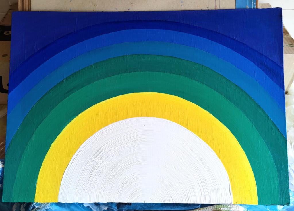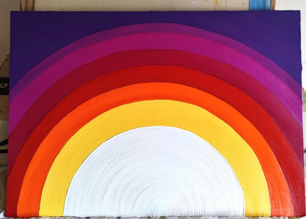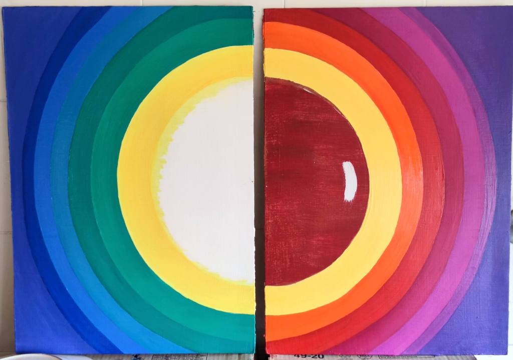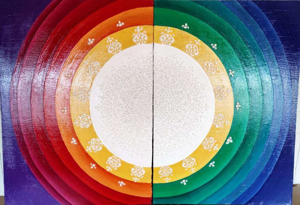 On the left, warm hues of yellow, orange, red, pink, and purple radiate outward, representing the passionate, nurturing, and creative aspects of feminine energy. On the right, cool tones of yellow, green, blue, and violet flow, embodying the intellectual, expansive, and calming facets of masculine energy. Together, they form a complete sphere, a testament to the interconnectedness of these forces. As Carl Jung observed, “Who looks outside, dreams; who looks inside, awakes.” These paintings invite the viewer to look inward, to recognize and harmonize the inherent energies within, finding the pure, luminous core of their own being.