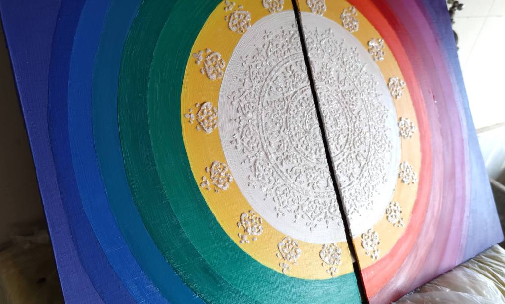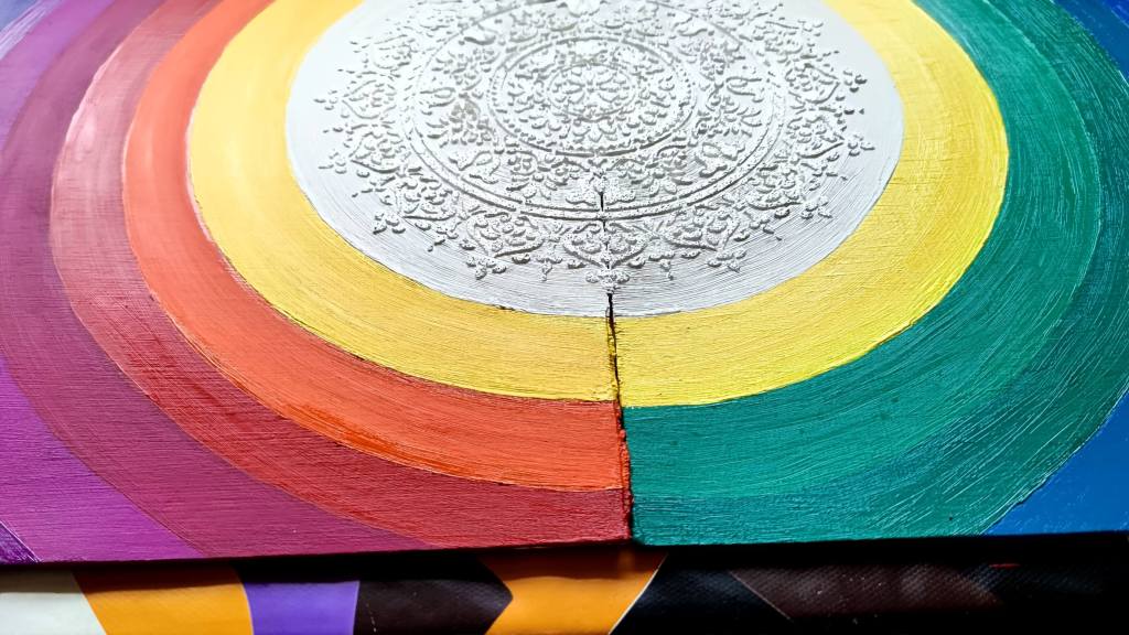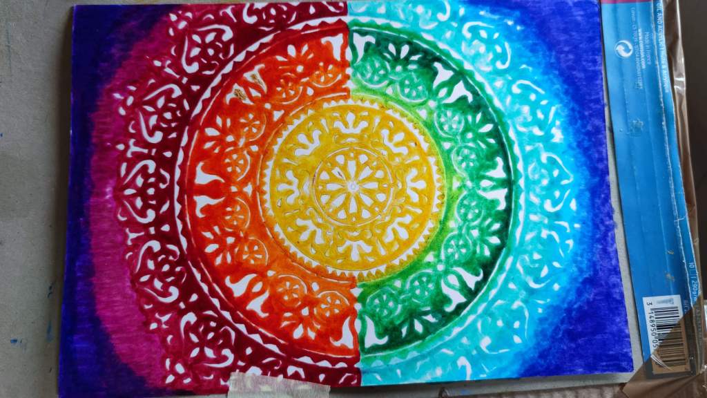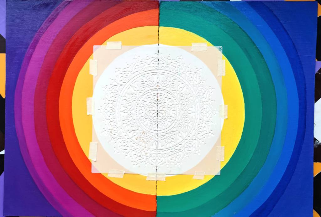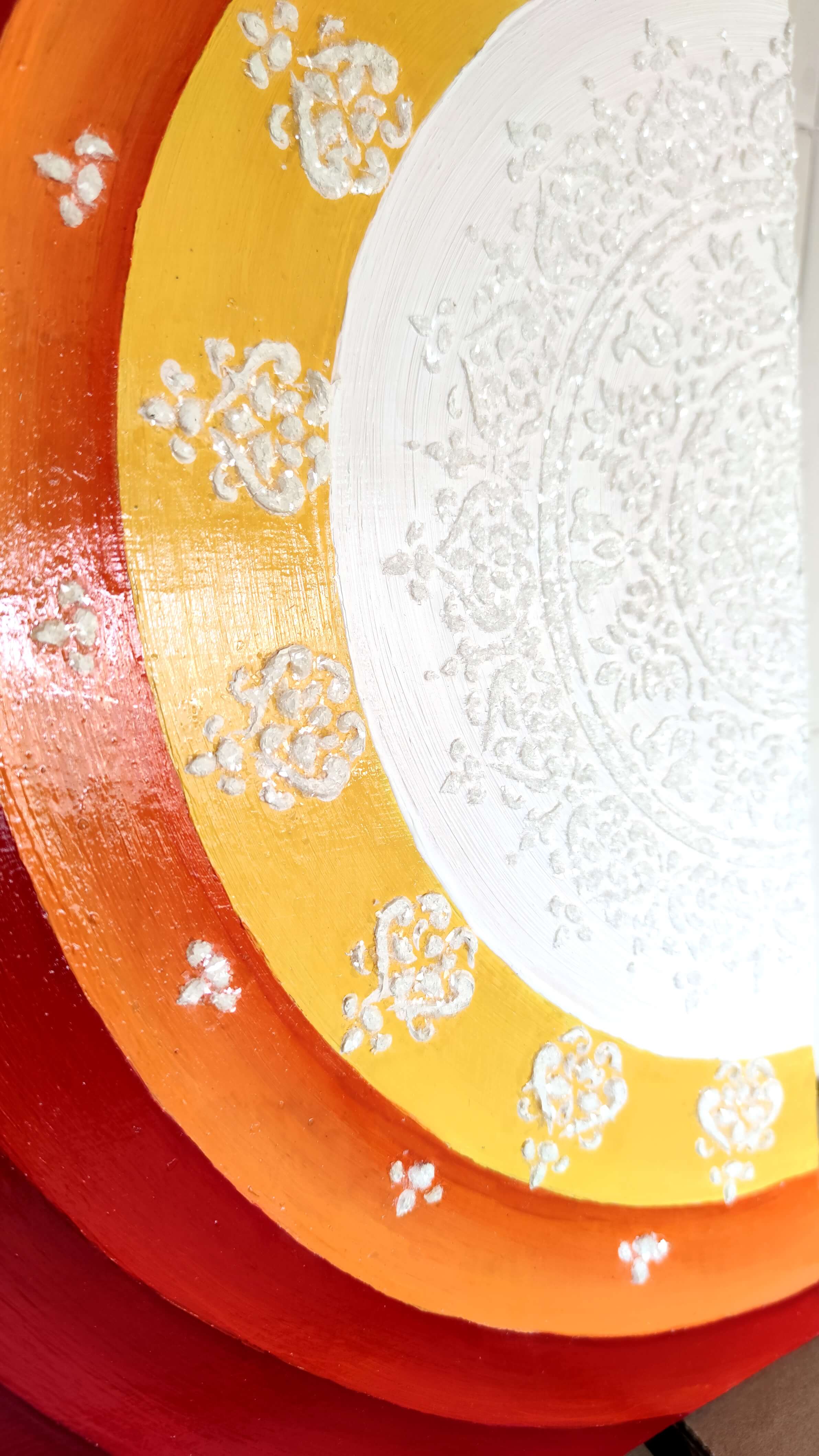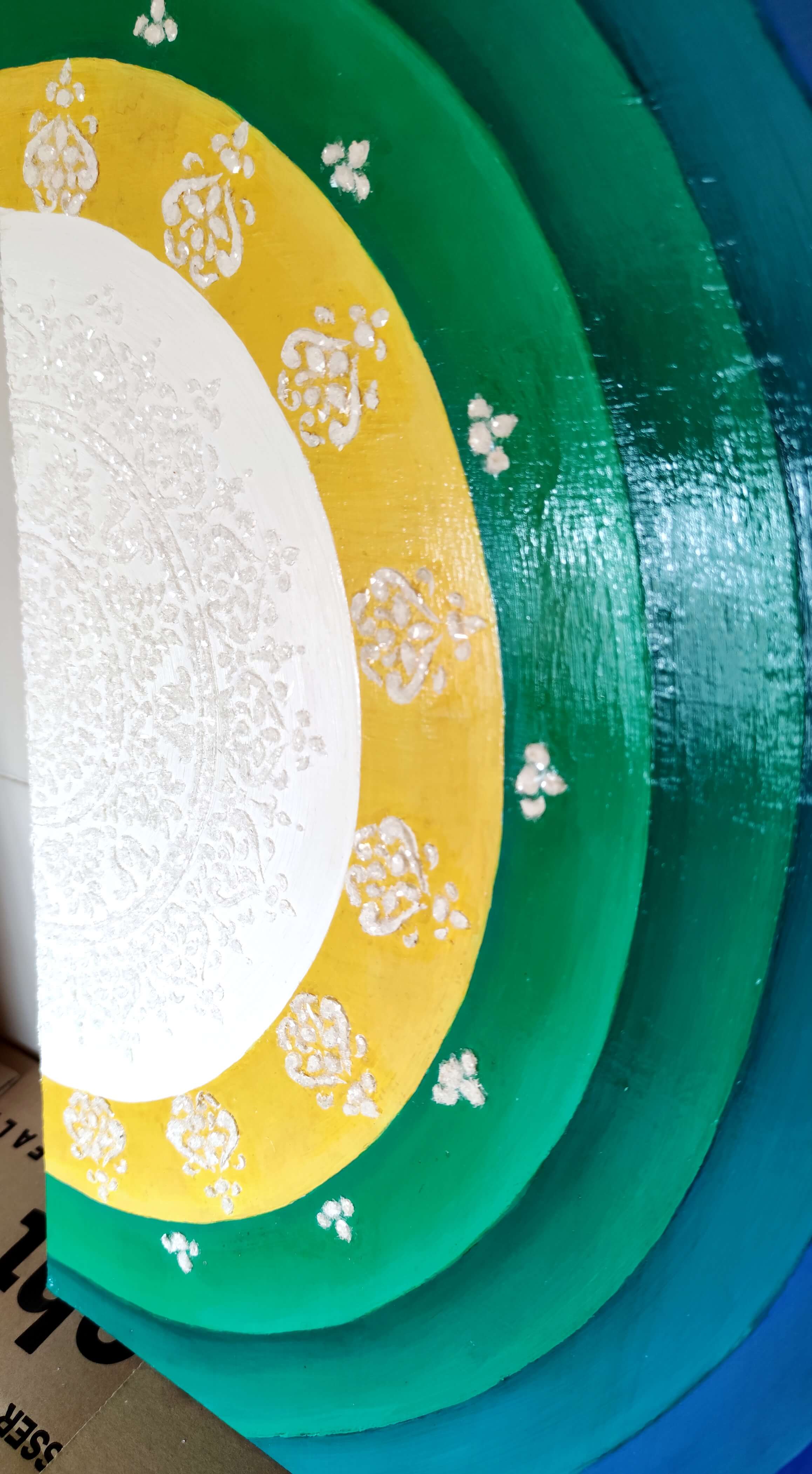 Acrylic paint and modeling paste for the center Mandala with crashed glass.